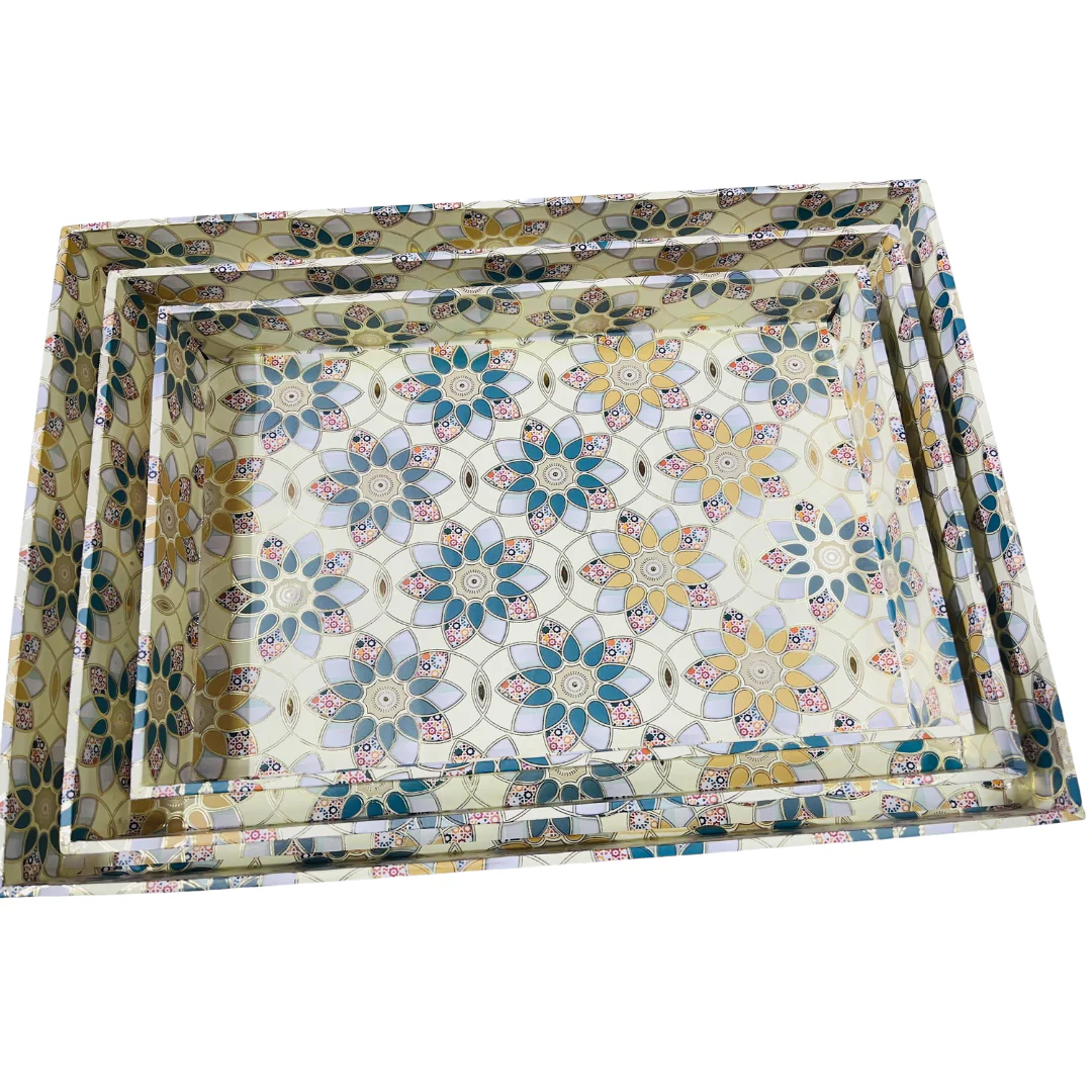 Enhance your serving experience with this beautifully crafted rectangular tray set, designed with a vibrant floral pattern in soothing pastel tones. The intricate geometric flower design adds a touch of sophistication and modern charm, making it perfect for both everyday use and special occasions.